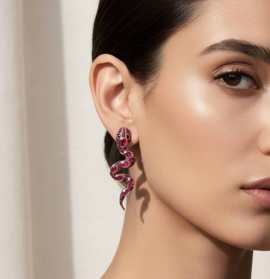 أطلقي العنان لجرأتك مع أقراط "سيربنتين روبي ويسبرز"، مزيجٌ ساحرٌ من الغموض والأناقة. تتميز هذه الأقراط بتصميم ثعبان متعرج، ملتفّ بانحناءةٍ أنيقة، ومرصع بأحجار كريمة وردية وحمراء ياقوتية متألقة. ملمسها الشبيه بالحياة، والمعزز بترصيعاتٍ مرصوفةٍ بدقةٍ ولمساتٍ سوداء عميقة للعينين، يُضفي على الثعابين حيويةً آسرة. ترمز هذه الأقراط اللافتة إلى التحوّل والأنوثة الجريئة، وهي قطعةٌ مميزةٌ للروح الواثقة والمتمكنة.
