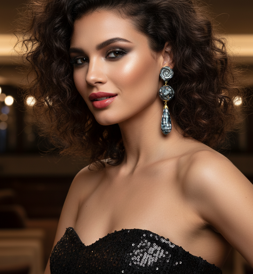 أضف لمسة من الأناقة الخالدة إلى مظهرك مع هذه الأقراط الرائعة المصنوعة من الفسيفساء ذات الصدفة الرمادية. تتميز هذه الأقراط بأزرار زهور مصنوعة بشكل معقد وتزدهر بسحر قزحي الألوان، وتتدرج إلى أشكال كروية على شكل دمعة، كل منها مزين بفسيفساء ساحرة من القشرة الرمادية الطبيعية. خفيفة الوزن ومتعددة الاستخدامات، وتوفر توازنًا مثاليًا بين الرقي والفن، مما يجعلها ضرورية لأي مجموعة مجوهرات.