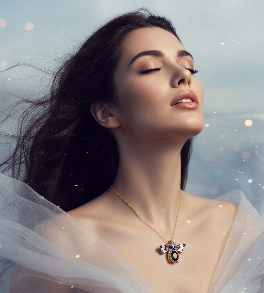 قلادة النحلة الجذابة والساحرة هذه، مصنوعة بخبرة لعرض أجنحة المينا باللون الفيروزي النابض بالحياة والأزرق العميق مع تفاصيل معقدة. جسم النحلة مزين بحجر الجمشت الكريم المذهل، الذي يشع بلون أرجواني غني يضيف لمسة من الملوكية والرقي. تتميز هذه القلادة بلمسة نهائية ذهبية فاخرة، وتجمع بين جمال الطبيعة والأناقة الخالدة. مثالية لإضافة لمسة غريبة ولكن راقية إلى أي ملابس، هذه القلادة هي قطعة مميزة تنضح بالسحر والأناقة. خيار مبهج لأولئك الذين يقدرون المجوهرات الفريدة المستوحاة من الطبيعة.