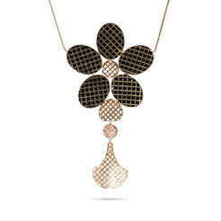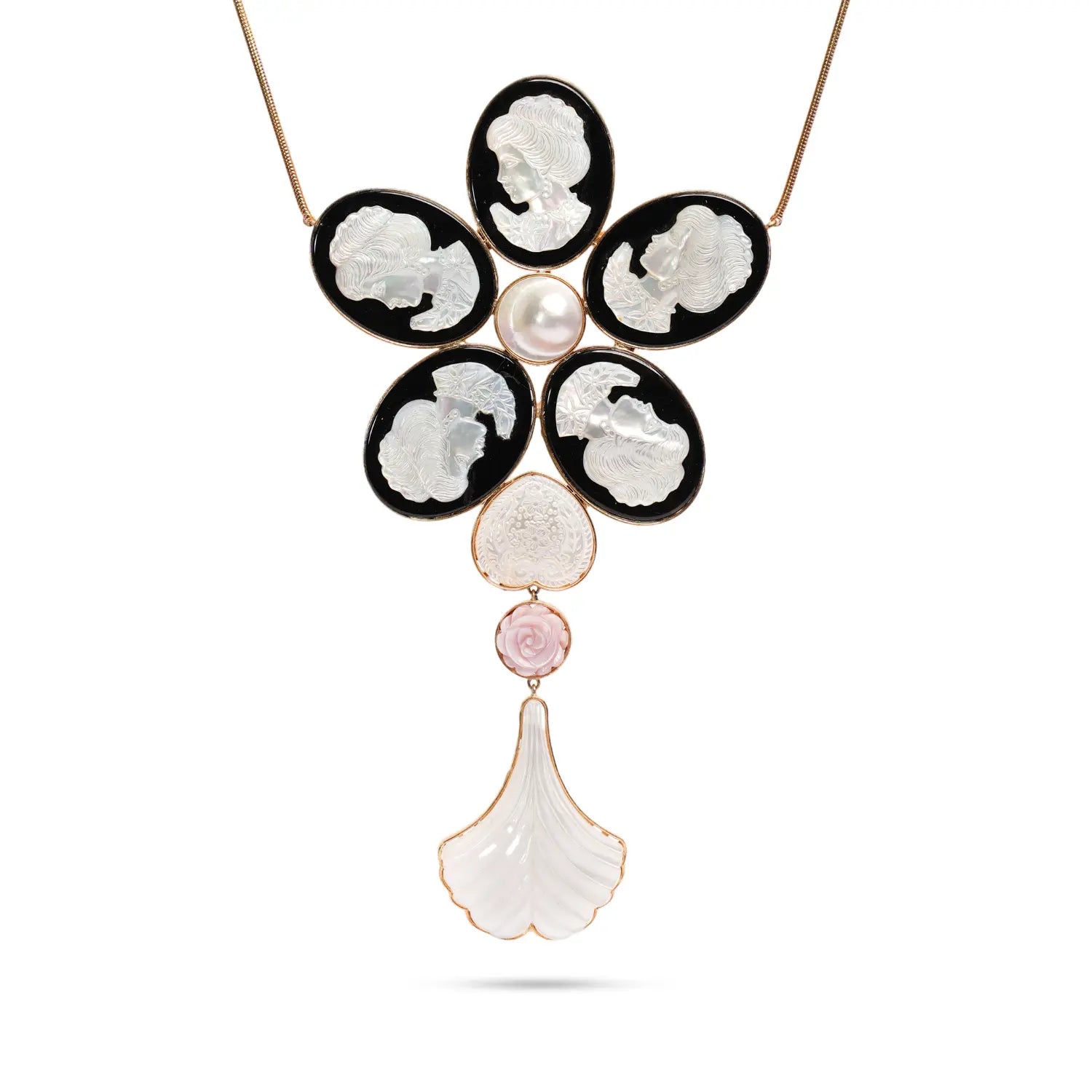 A statement piece that feels like wearable art, the Cameo Necklace brings together timeless elegance and vintage charm. Five intricately carved mother of pearl cameos form a blooming floral silhouette, each framed against a deep black onyx background for striking contrast. At the heart rests a luminous pearl, adding softness and classic refinement. Suspended below is a trio of delicate accents, a textured mother of pearl drop, a pastel rose carving, and a fan shaped shell motif. All working together to create graceful movement and a dreamy, heirloom like finish. Bold, romantic, and utterly unique, this piece is designed for those who adore jewellery with history, artistry, and a touch of whimsy. Perfect for special occasions or to transform a simple outfit into something unforgettable.