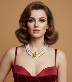 عقد سيليست ريفيري، مزيج متناغم من الأناقة والقوة، يتميز بثلاثة صفوف من اللآلئ المضيئة، مثبتة بميدالية ذهبية جريئة مر...