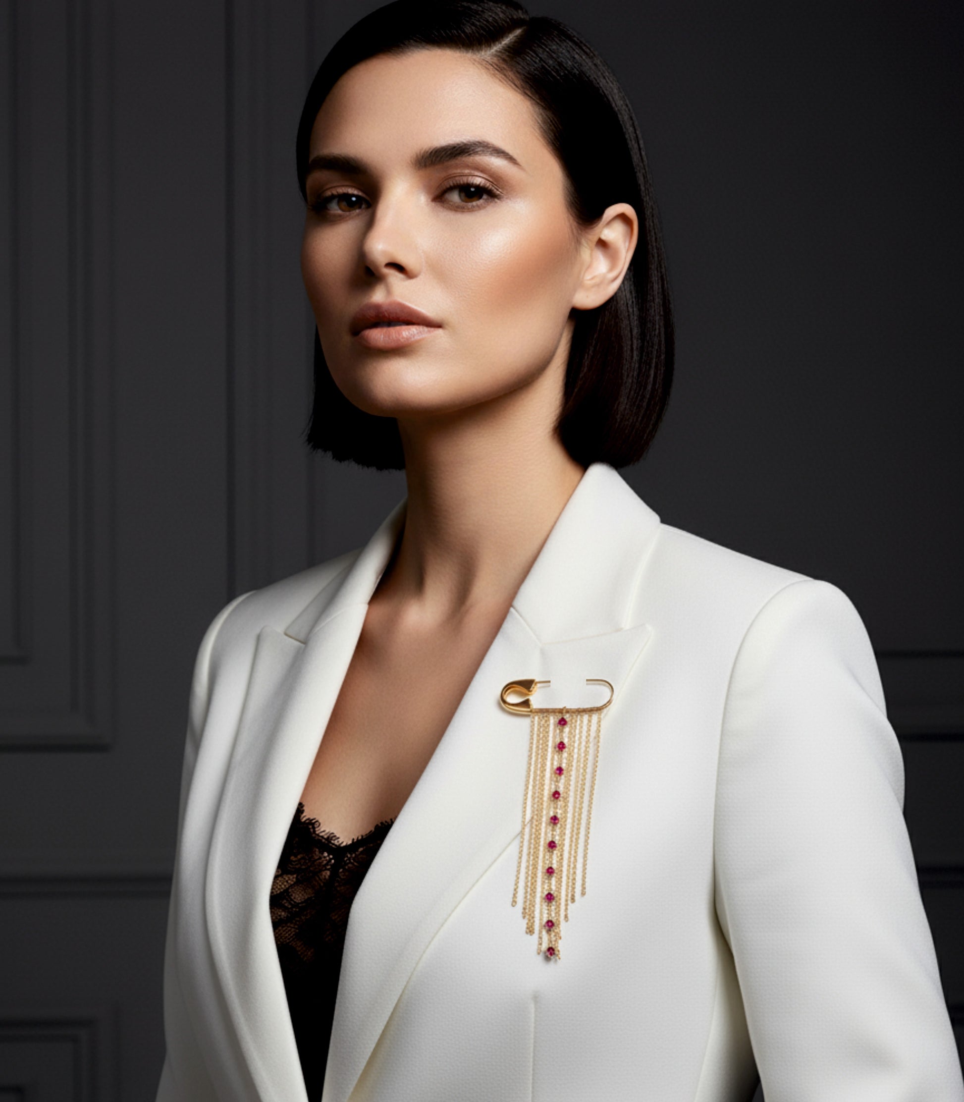بروش "كريمسون درايب" ينضح بالفخامة والذوق الفني بمزيجه الأخّاذ من الأحجار الكريمة القرمزية الداكنة والسلاسل الذهبية. صُمم البروش على شكل دبوس أمان أنيق، ويعرض صفًا مركزيًا ساحرًا من الأحجار الكريمة بلون الياقوت، كل منها مُرصّع بأناقة بإطار مُحاذي، ومُشكّلًا لمسةً عموديةً جريئة. تُحيط بهذه الأحجار الكريمة طبقاتٌ مُتتالية من السلاسل الذهبية الرفيعة، تتدلى برشاقة لتُشكّل مظهرًا أنيقًا وغنيًا. يُضفي هذا الإكسسوار الرائع والأنيق لمسةً فاخرةً على أي إطلالة، مثاليًا لإطلالات السهرة أو لإضفاء لمسةٍ جريئة على الملابس اليومية.