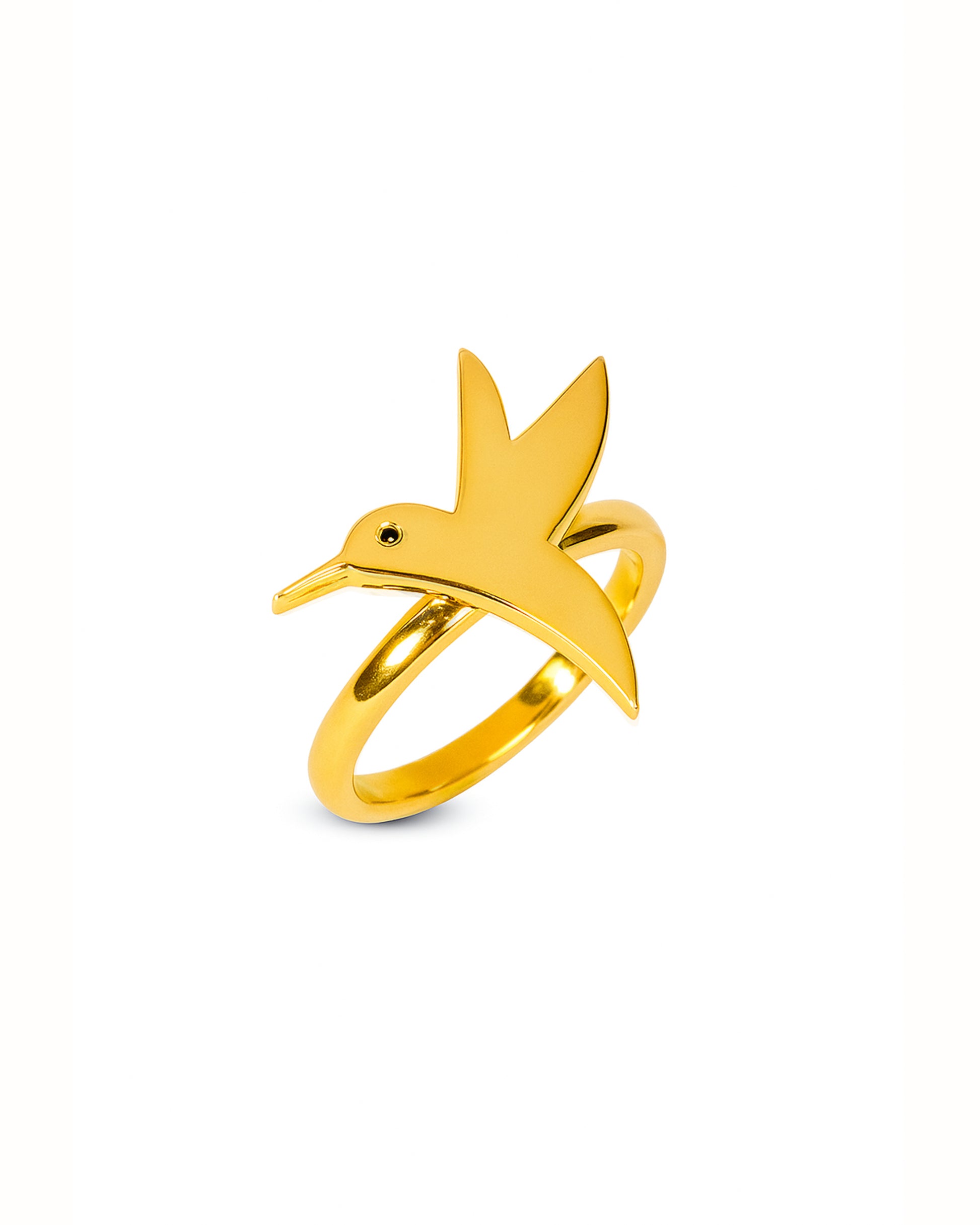 Crafted in gold plated sterling silver, the Hummingbird Ring captures the grace and vitality of one of nature’s most enchanting creatures. Sleek and modern in form, it symbolizes freedom, joy, and resilience — a reminder to always move with lightness and purpose. Perfect for everyday wear or as a statement of individuality, this piece embodies effortless elegance with a touch of whimsy.