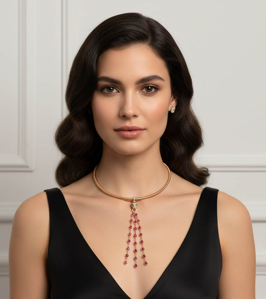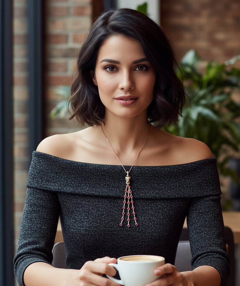 اخطفي الأنظار بقلادة "نظرة النمر"، رمزٌ آسرٌ للقوة والأناقة. تتميز القلادة برأس نمرٍ بتفاصيل بديعة، مرصعٍ بكريستالاتٍ متلألئة، وعينين ثاقبتين بلون الزمرد الأخضر. تتدلى هذه القطعة الجريئة والأنيقة من سلسلةٍ رفيعة، لتتناغم بشكلٍ مثالي مع أقراط "حجاب النمر" أو لتتألق بشكلٍ منفرد. تصميمٌ خالدٌ لمن تُضفي ثقتها بنفسها لمسةً مميزة.