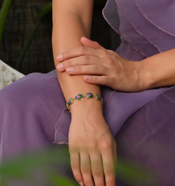 This exquisite bracelet showcases a charming series of intricately crafted turtle charms, each adorned with vivid green and deep blue enamel with red rubies. The turtles' shells are highlighted by intricate geometric patterns, creating a captivating, mosaic-like effect that evokes elegance and sophistication. The vibrant red center stones bring a touch of warmth and richness, while the gold-tone chain adds a classic, timeless finish. This bracelet is perfect for anyone who appreciates playful, yet refined jewelry that captures the beauty of nature with a dash of luxury. Whether worn solo or layered, it promises to be a delightful conversation starter and a beloved addition to any collection.