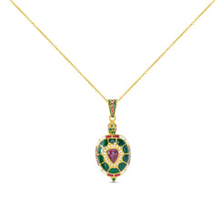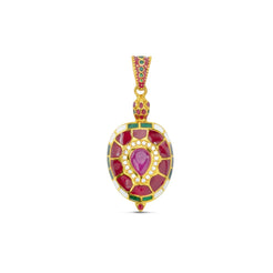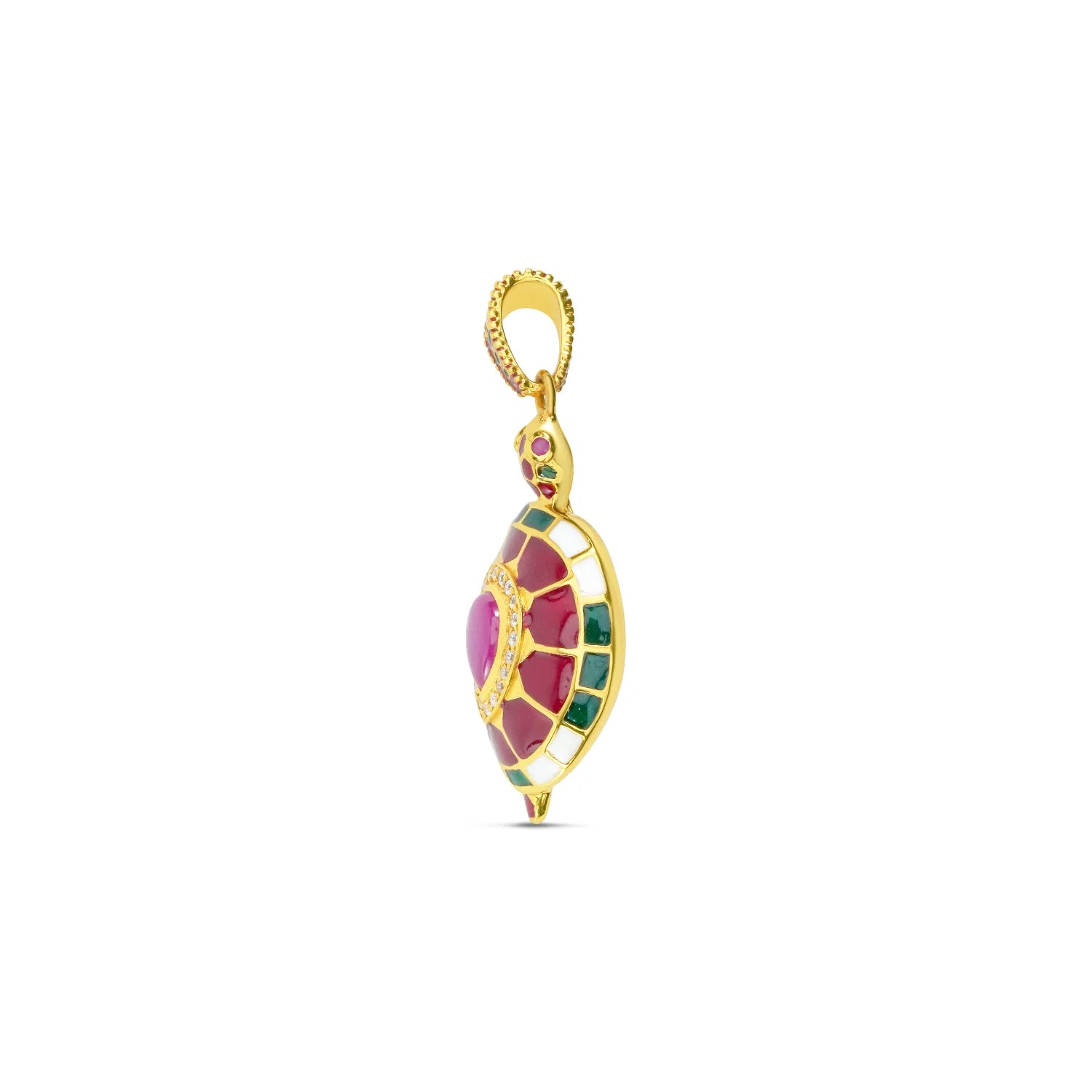 A symbol of wisdom, protection, and timeless beauty, the Turtle Glam pendant is a celebration of nature rendered in fine artistry. Crafted in Gold plated Silver, the pendant features a richly detailed shell adorned with deep enamel accents, punctuated by delicate highlights. At its heart rests a pear shaped Ruby, encircled by a halo of shimmering Quartz that add a soft, radiant brilliance. The turtle, long revered as a guardian and bearer of longevity, lends this piece a deeper meaning, making it not just an adornment, but a talisman of calm strength and enduring grace. This pendant is perfect for everyday elegance or as a statement of quiet luxury. A piece that blends heritage-inspired design with contemporary finesse, designed to be cherished for years to come.