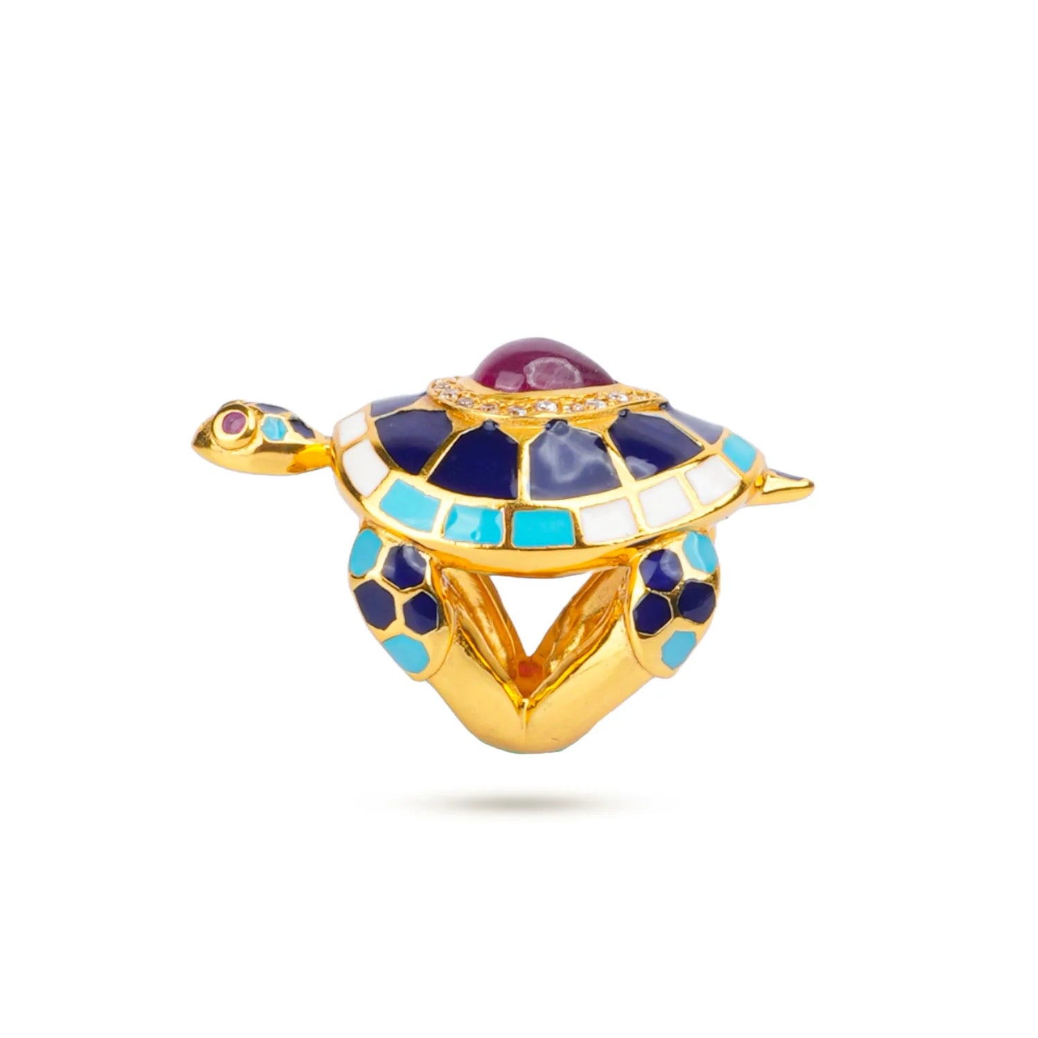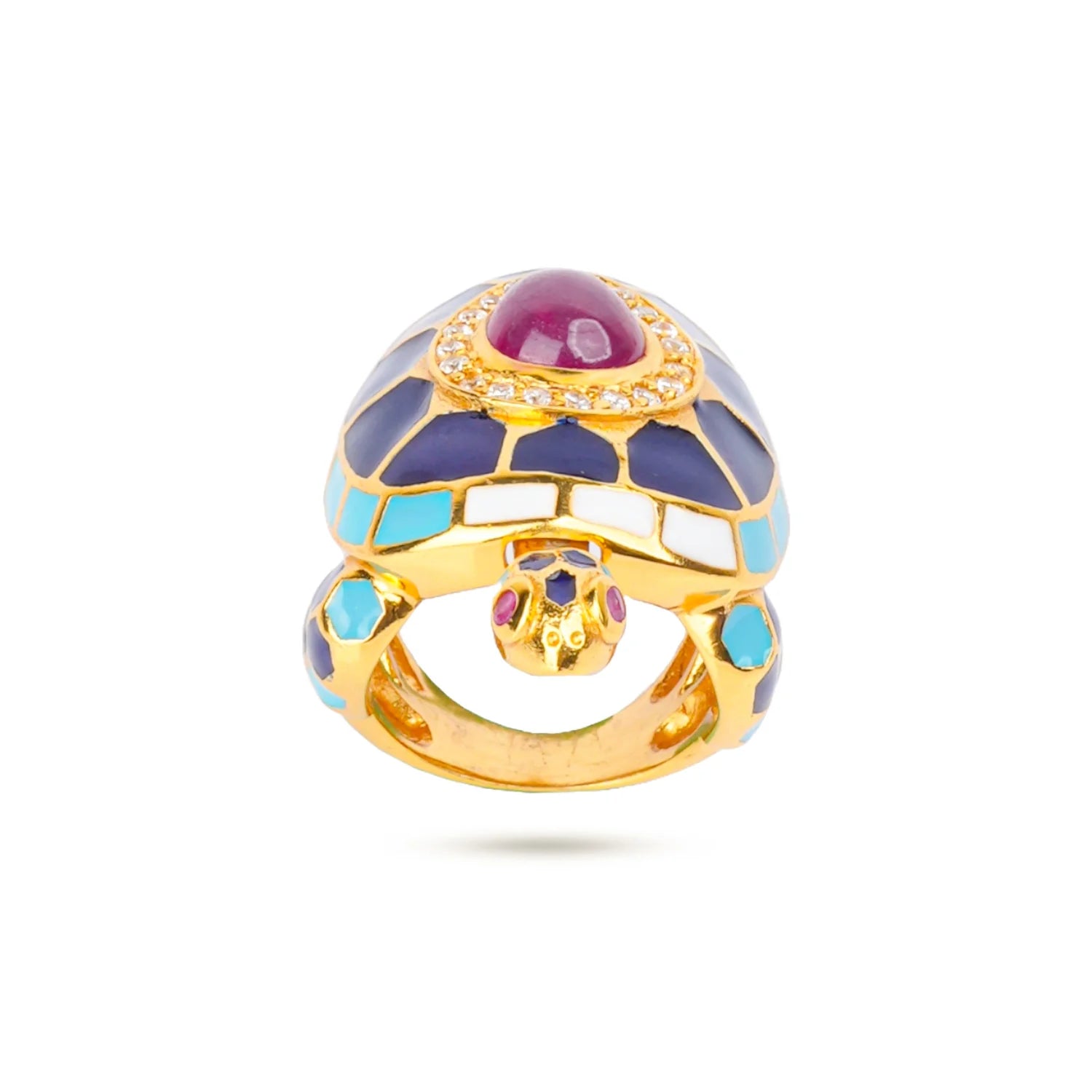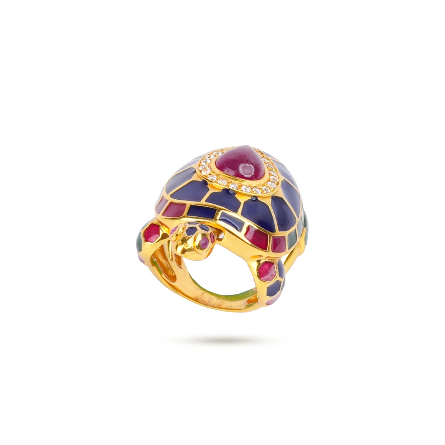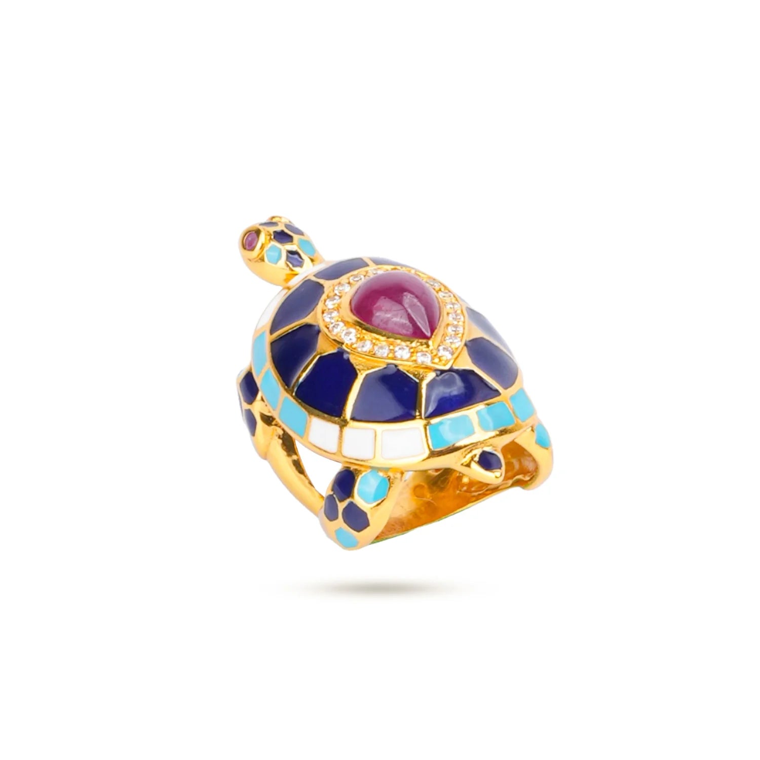 Inspired by the quiet wisdom of the sea, the Turtle Glam Ring celebrates protection, perseverance, and timeless grace. Designed in the shape of a majestic turtle, its shell is adorned with coloured enamel mosaics, each bordered with luxe gold detailing. At the heart lies a pear shaped ruby, haloed by shimmering stones that add a radiant glow. Symbolic and striking, this statement ring carries the spirit of endurance and good fortune an artistic talisman for the modern muse.