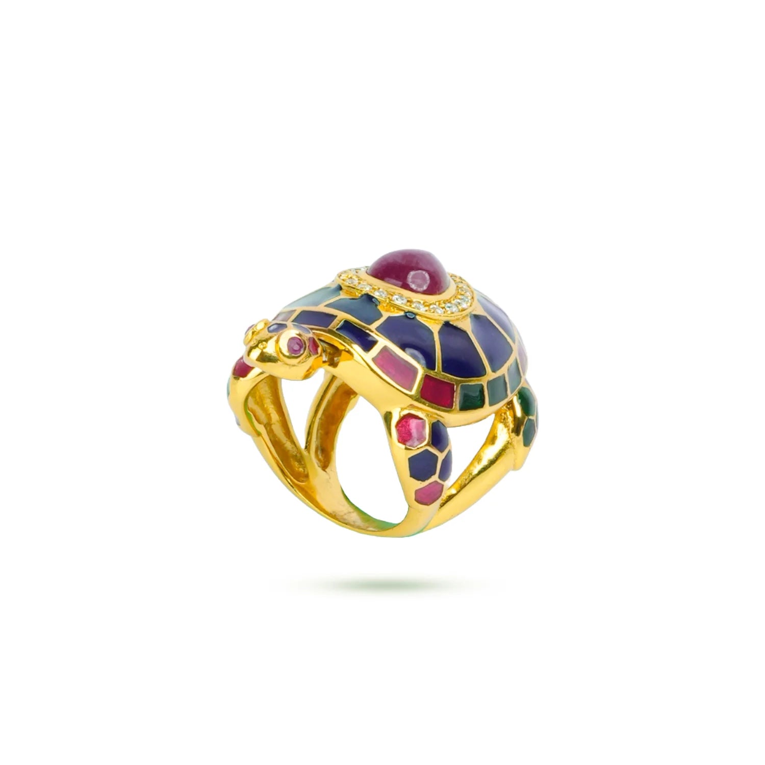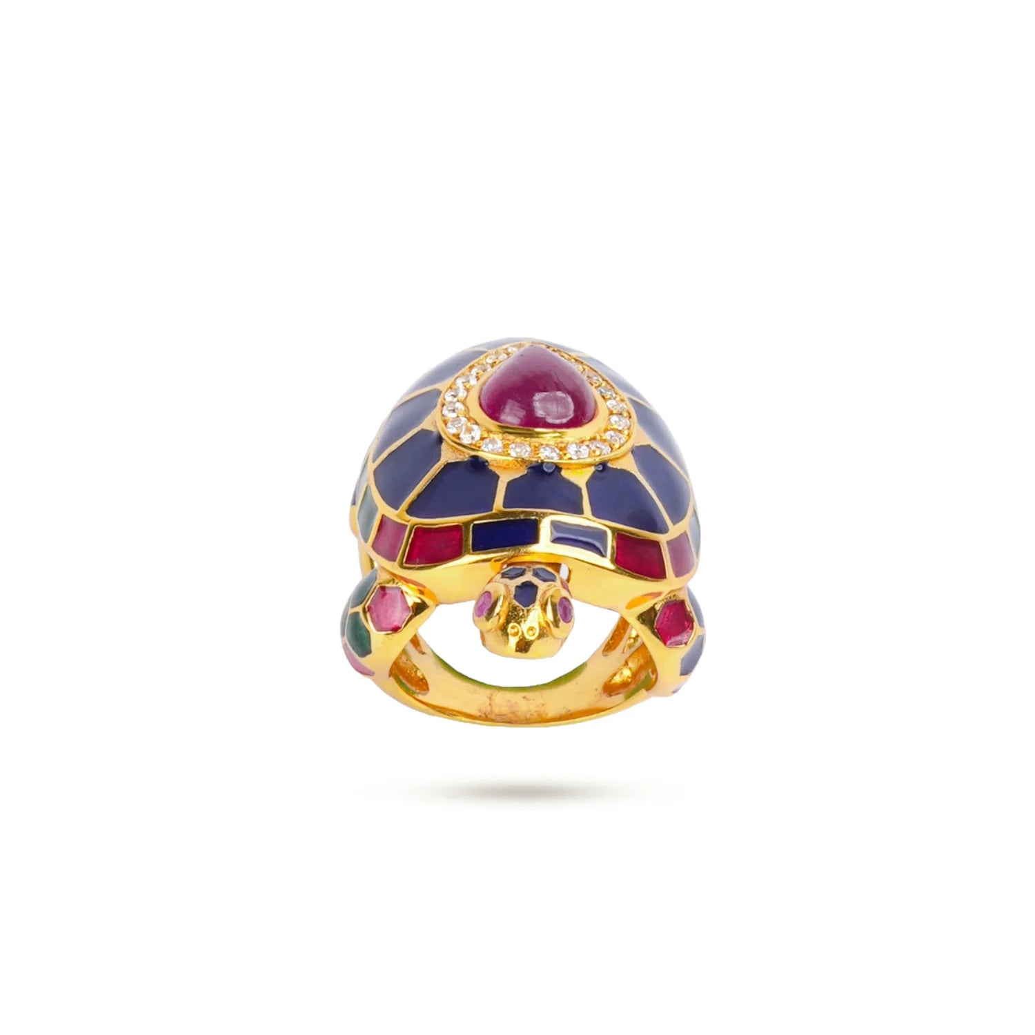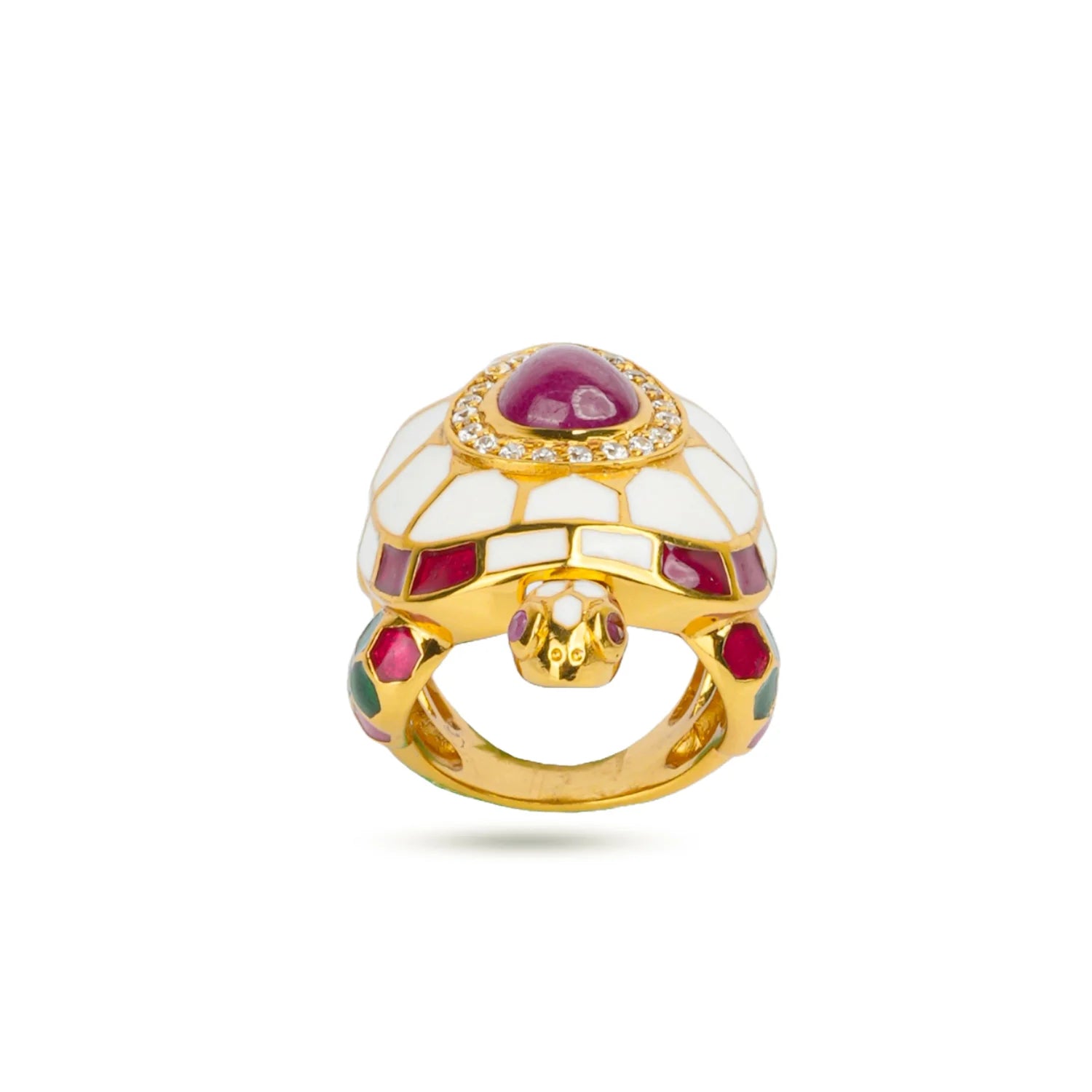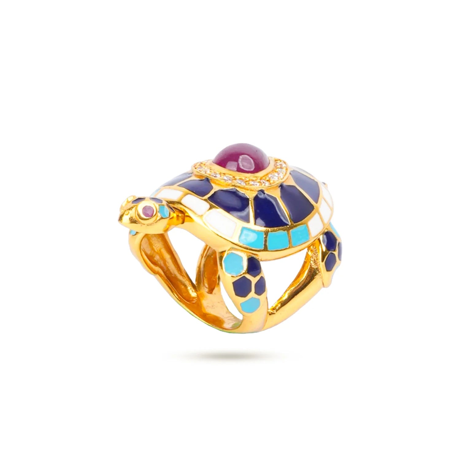 Inspired by the quiet wisdom of the sea, the Turtle Glam Ring celebrates protection, perseverance, and timeless grace. Designed in the shape of a majestic turtle, its shell is adorned with coloured enamel mosaics, each bordered with luxe gold detailing. At the heart lies a pear shaped ruby, haloed by shimmering stones that add a radiant glow. Symbolic and striking, this statement ring carries the spirit of endurance and good fortune an artistic talisman for the modern muse.