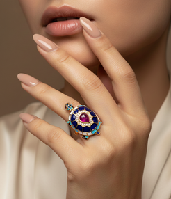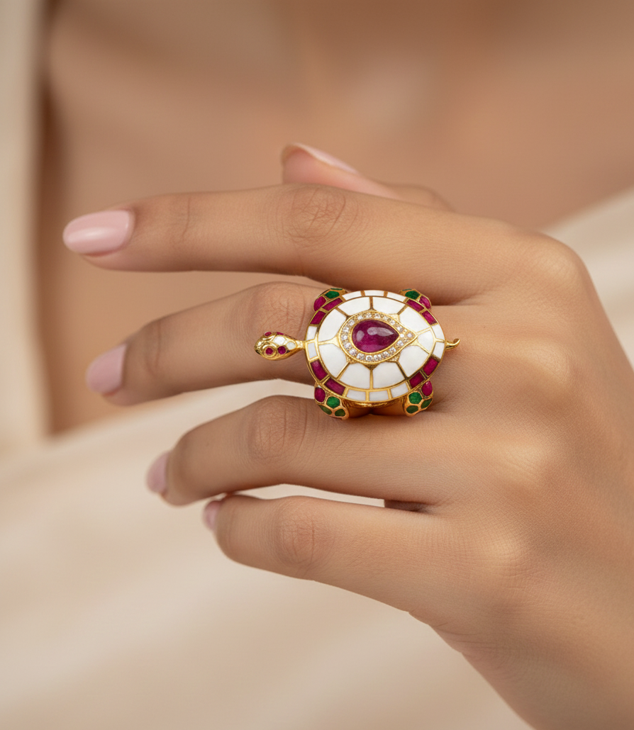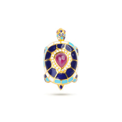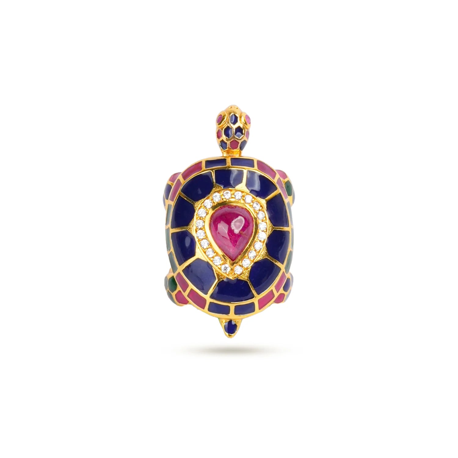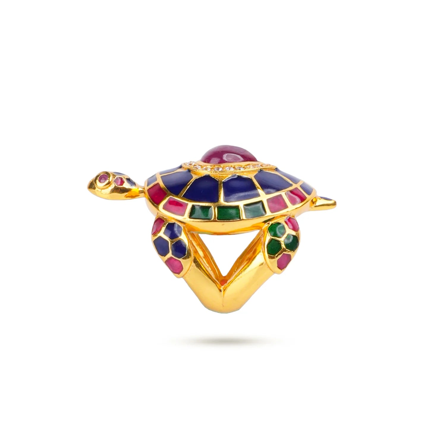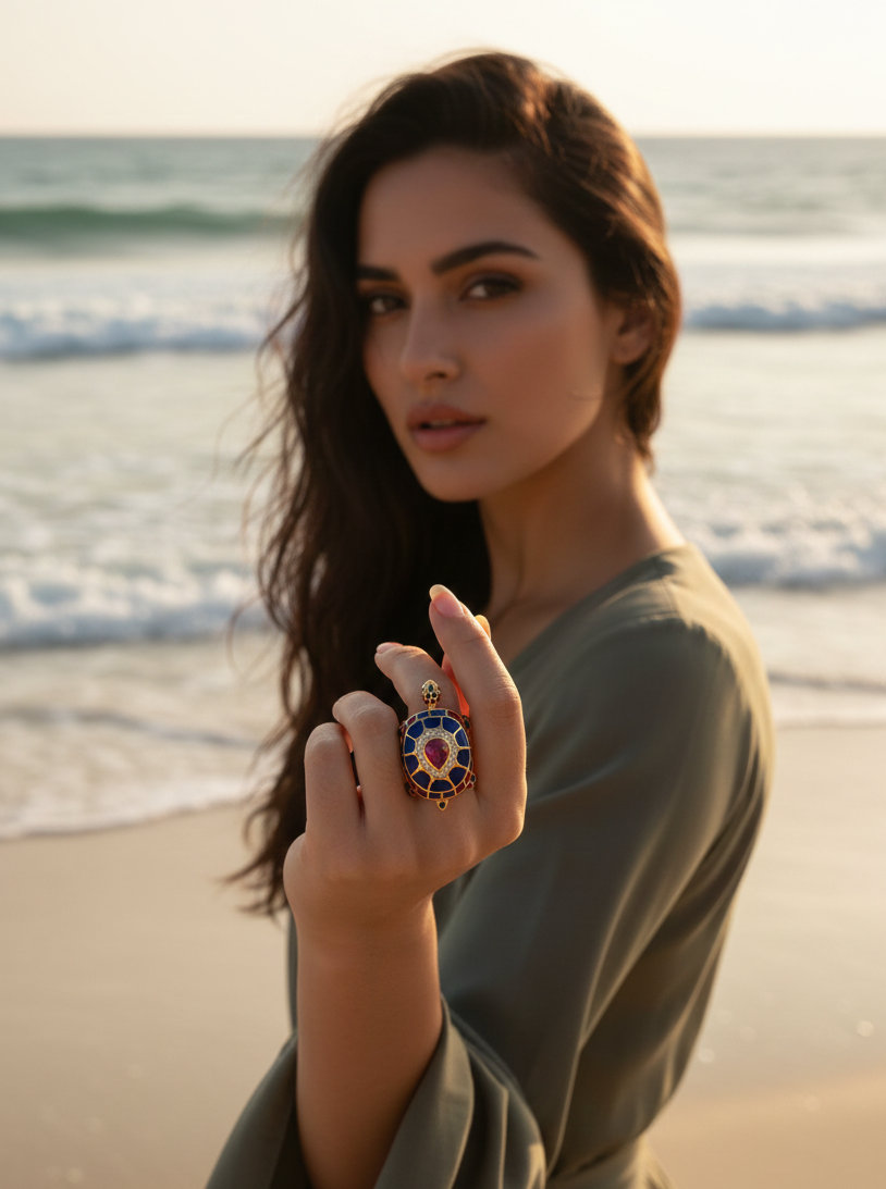 Inspired by the quiet wisdom of the sea, the Turtle Glam Ring celebrates protection, perseverance, and timeless grace. Designed in the shape of a majestic turtle, its shell is adorned with coloured enamel mosaics, each bordered with luxe gold detailing. At the heart lies a pear shaped ruby, haloed by shimmering stones that add a radiant glow. Symbolic and striking, this statement ring carries the spirit of endurance and good fortune an artistic talisman for the modern muse.