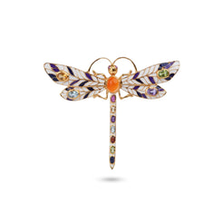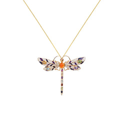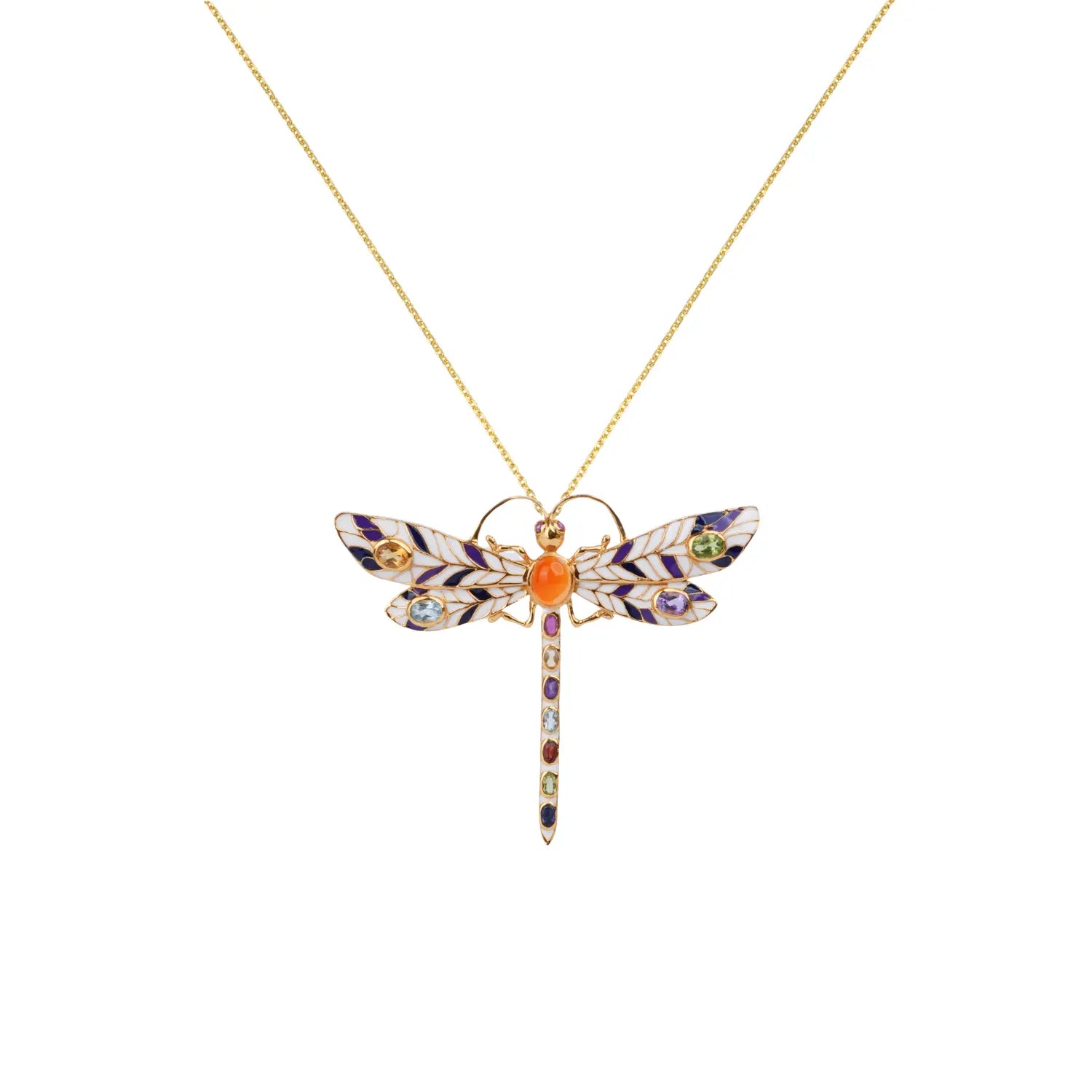 A tribute to the quiet magic of morning skies, Wings of Dawn captures the fleeting grace of a dragonfly mid-flight. Delicate wings, brushed with enamel, shimmer like the first light breaking over a still horizon. A vibrant stone anchors the form, echoing nature’s awakening with a burst of life and renewal. Adorned with a trail of coloured tourmaline along its golden body, this pendant dances with the spirit of air — light, free, and full of transformation.