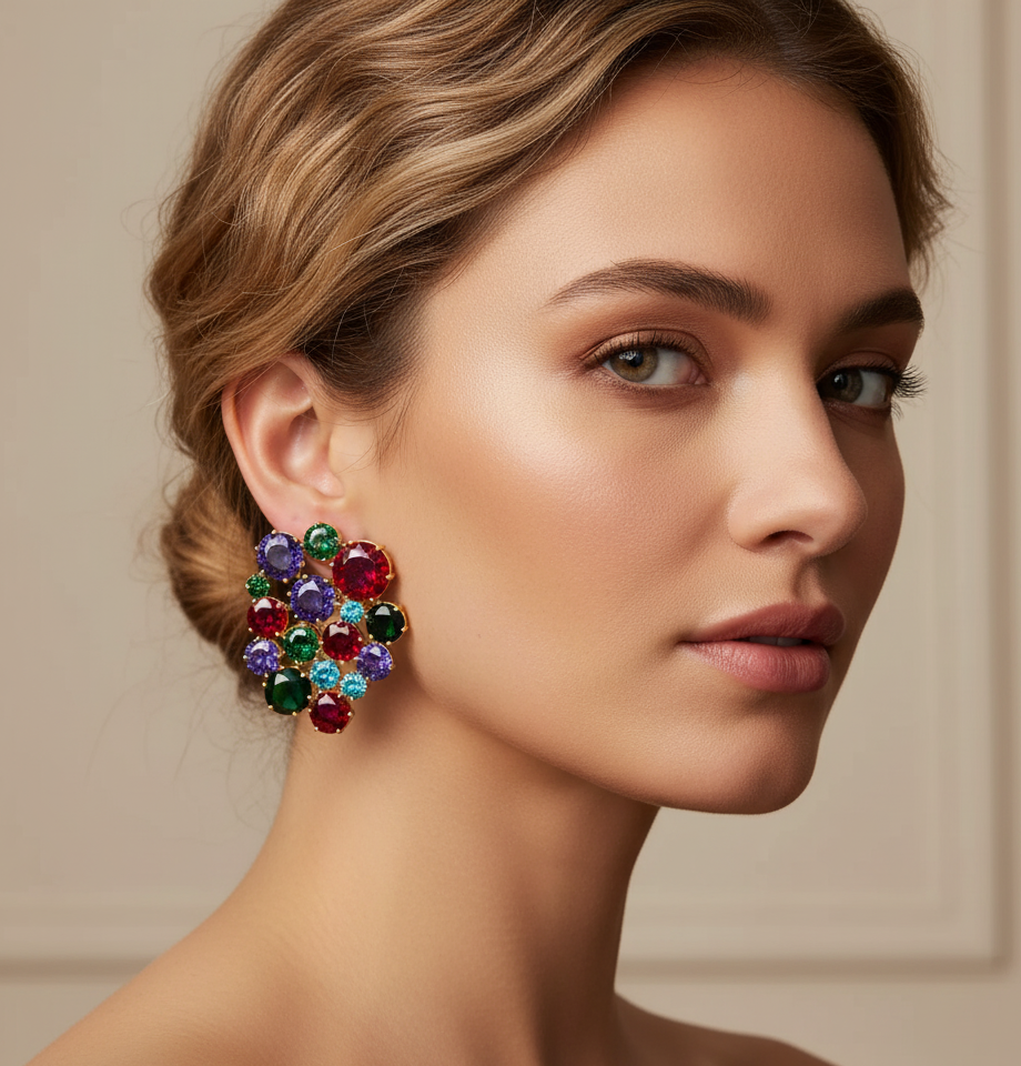 The Aurora Royale Earrings are a majestic celebration of light, color, and timeless glamour. Inspired by the dazzling hues of the aurora borealis, these earrings showcase a stunning mosaic of gemstones in vivid emerald green, sapphire blue, ruby red, amethyst purple, and midnight tones. Set in radiant gold finish, each earring forms an intricate floral constellation that dances with brilliance and elegance. Whether worn as a statement on their own or paired with the Aurora Royale Necklace, these earrings exude regal sophistication and celestial beauty, perfect for evenings when only extraordinary will do.