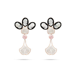 A romantic blend of vintage artistry and modern statement design, these earrings celebrate timeless femininity through exquisite detail. Three carved mother of pearl cameos sit atop like delicate petals, framed in bold black onyx background for a dramatic contrast. Beneath them rests a finely etched mother of pearl drop, adding texture and old world charm. Elegant, sculptural, and undeniably unique, these earrings are perfect for evening wear, festive occasions, or any moment when you want your jewellery to feel like art.