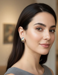 A captivating blend of colorful semi-precious stones, the Celestial Harmony earrings radiate vibrant elegance. Each gemstone, set in a graceful gold frame, reflects the colors of the sky — from serene blues to warm golden hues and lush greens. Perfect for adding a celestial touch to any outfit, these earrings celebrate the beauty of nature's palette.