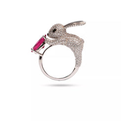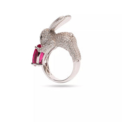 Whimsy meets elegance in the Crystal Bunny Treasure Ring, an enchanting piece that brings playful charm to fine jewelry. Sculpted in gleaming white metal, the ring features a dazzling, pavé-set bunny poised with curiosity, holding a radiant pair of deep pink gemstones like a prized discovery. The meticulous craftsmanship and sparkling details make it a standout piece—both luxurious and lighthearted. Perfect for those who cherish individuality and storytelling in their jewelry.