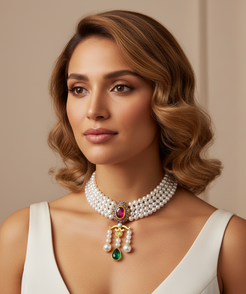 The Empress of the Realms Necklace is a majestic celebration of regal splendor and meticulous craftsmanship. Composed of four cascading strands of luminous white pearls, it commands attention with a grand centerpiece—an oval crimson gemstone encircled by a vibrant halo of amethyst and sapphire-hued quartz. Beneath this noble crest, golden filigree suspends an arrangement of pearl drops, a sparkling yellow gem, and a striking emerald-green teardrop, creating a dramatic focal point. Fit for royalty, this necklace evokes the grandeur of ancient dynasties and is perfect for ceremonial elegance or lavish evening wear.