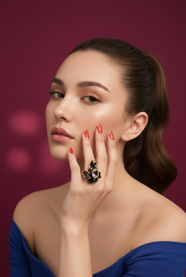 Imbued with a sense of majestic grace, this elephant-shaped ring captivates with its bold design and mystical charm. Crafted from sleek black enamel, the ring elegantly contours the finger, while its centerpiece showcases a mesmerizing amethyst gemstone. The rich hues of the stone contrast beautifully against the dark backdrop, reflecting a sense of regal allure. Perfect for those who appreciate both statement jewelry and the symbolic strength of the elephant, this ring seamlessly blends elegance with a touch of the exotic.