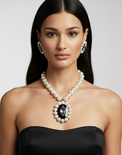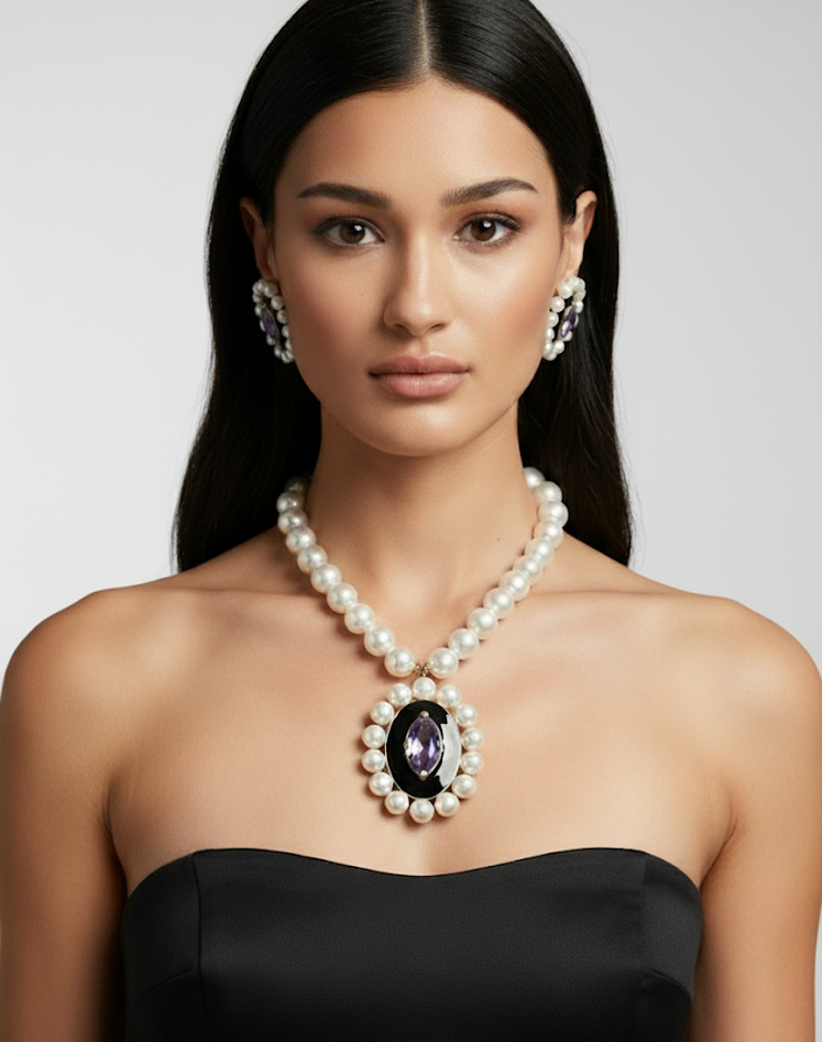 The Midnight Orchid Pendant Necklace is a refined statement of timeless elegance. Suspended from a classic strand of luminous white pearls, the pendant features a striking marquise-cut quartz in a delicate lavender hue, set within a glossy black enamel oval bordered in gold finish. Surrounding the centerpiece, a radiant halo of perfect pearls adds grace and dimension. With its bold contrast of dark and light elements, this piece channels vintage allure and modern sophistication—ideal for evening occasions or elevating any formal ensemble.