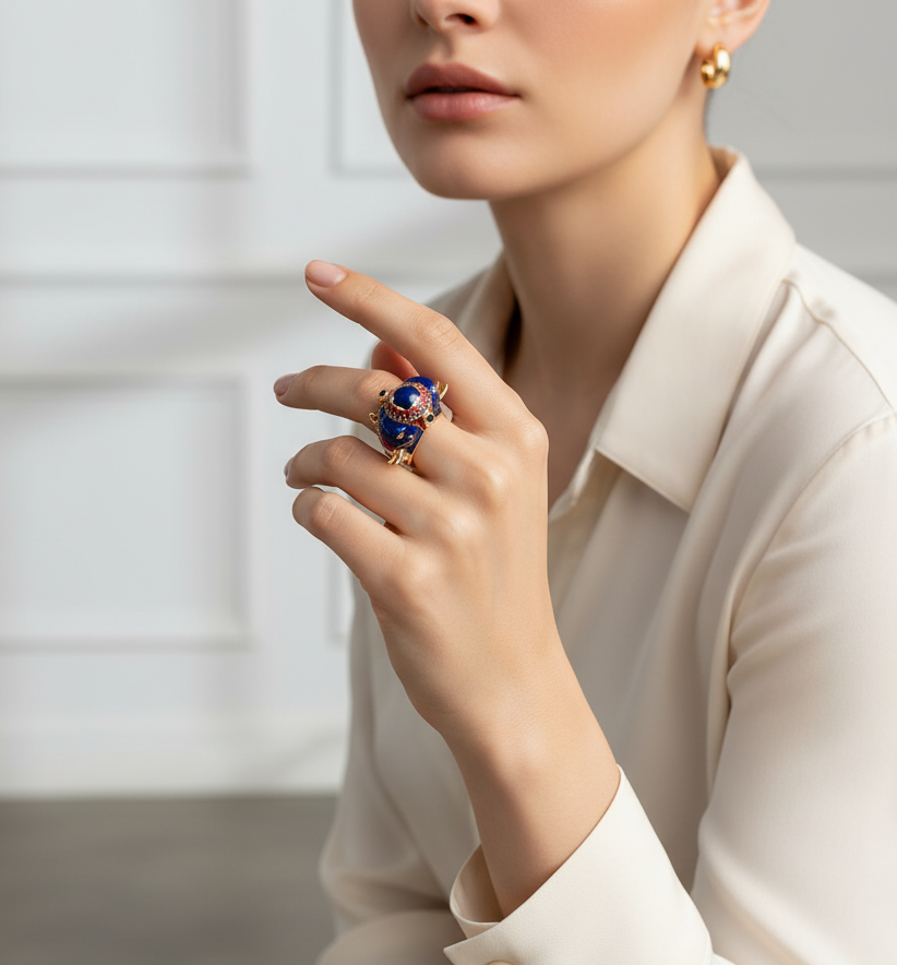 Make a bold statement with the Royal Tusker Ring, a vibrant tribute to regality and strength. Featuring two intricately enamelled elephants facing outward, this ring captures the majesty of royal processions. Drenched in deep blue, crimson, and gold, with delicate tusk details and crowned with a central gemstone sapphire, it evokes the grandeur of royal heritage. Handcrafted to perfection, this ring is not just jewellery — it’s a symbol of power, protection, and timeless tradition.