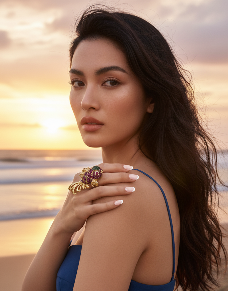 This whimsical ring is a stunning celebration of craftsmanship and aquatic elegance. Shaped like a graceful fish, the piece is brought to life with a vibrant array of Gemstones. The body shimmers with deep red rubies set in intricate gold latticework, mimicking delicate scales. Its head is encrusted with green peridots, adding contrast and depth, while the ruby eye adds a hypnotic focal point. Flowing, sculptural fins crafted in rich gold tones complete the design, creating a sense of movement and fantasy. Bold yet playful, this ring is perfect for anyone who loves statement jewelry that tells a story.