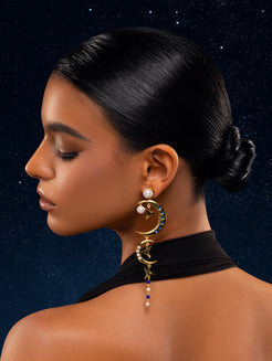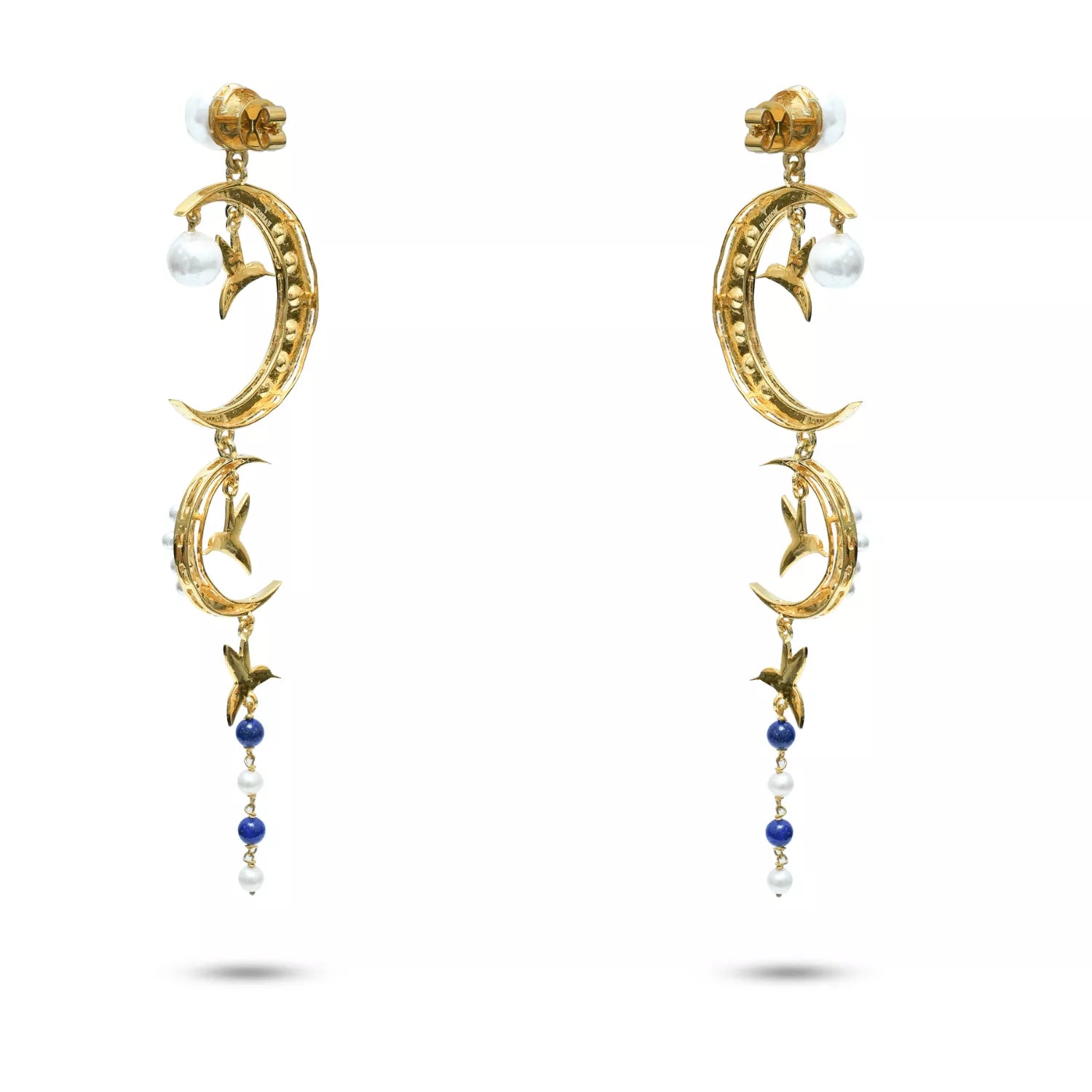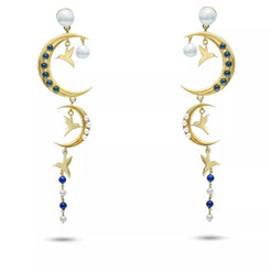 Echoing the celestial elegance of the Wings of the Moon Necklace, these earrings capture the delicate dance of freedom and light. Handcrafted in gold plated silver, each earring features twin crescent moons adorned with deep blue sapphires and radiant shell pearls, connected by graceful birds in flight. Their cascading silhouette mirrors the moon’s serene descent across a starlit sky, luminous, fluid, and endlessly captivating. Designed for the dreamer who carries the magic of the night wherever she goes.
